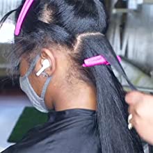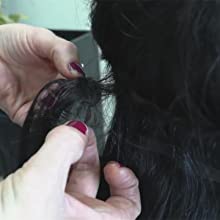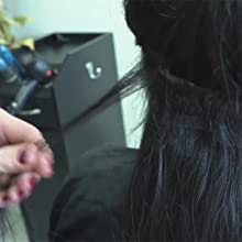 1.Move your hair out of the way to expose the tape in hair extensions. Hold the hair that you moved out of the way in place with a clip.