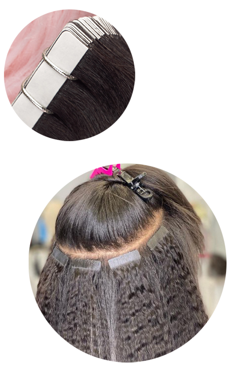 Tape in extensions are thin, lightweight tape wefts that get “sandwiched” together in between your own hair. They require no tools or chemicals to get applied, can last 8-12 weeks, and are reusable up to three or more applications. Tape in extensions are perfect for adding length, color effects, and volume in under an hour.
